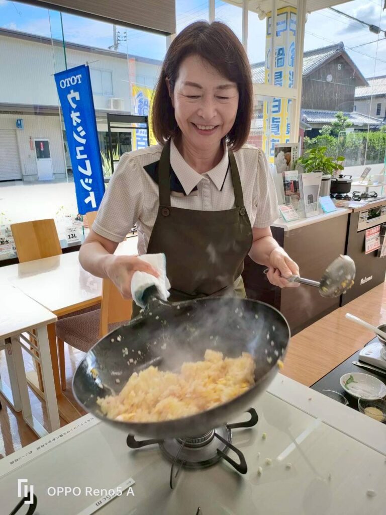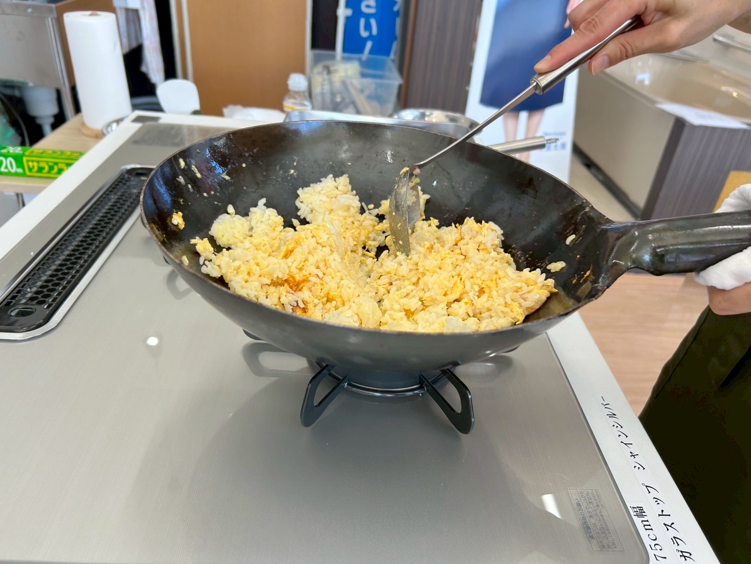 今日はスタッフと一緒に、ガスコンロを使ってチャーハンを作りました。