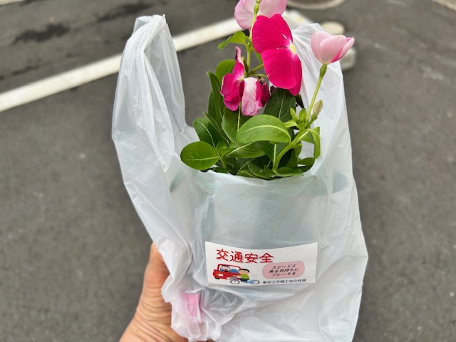 スーパーの入口でお買い物に来られた方に、かわいい花の苗をお渡ししながら「安全運転をお願いします」とお声かけしました。