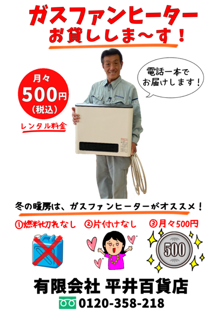 平井百貨店ではガスファンヒーター+ホース+ソケット+設置まで全てがセットで月々レンタル500円(税込)です。(当社ガスユーザーさまのみ)