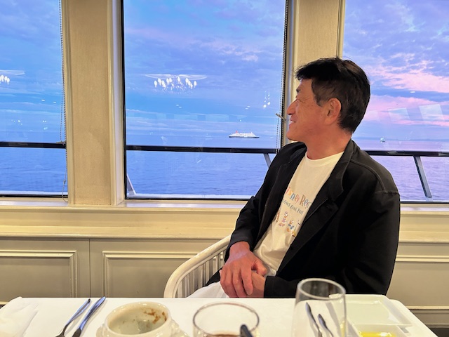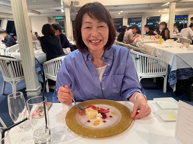 クルーズ船で夕日が沈む景色を眺めながら、おいしいお料理をいただきました。