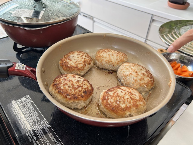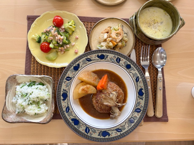 メインの和風ハンバーグは、味噌煮込み、スープは長いもを入れてとろふわに。