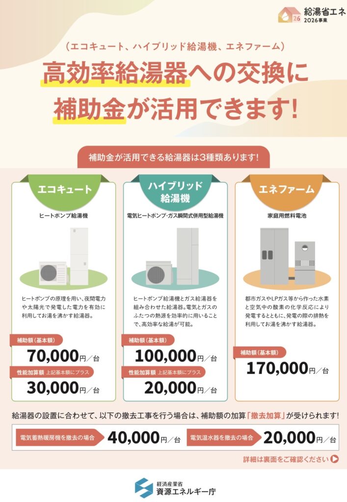 今年も始まった【給湯省エネ2026事業】は、エコキュート・ハイブリッド給湯器・エネファームの設置に対して、補助金が受けられる制度です。
