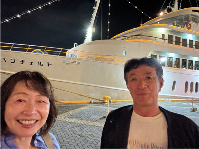 クルーズ船で夕日が沈む景色を眺めながら、おいしいお料理をいただきました。