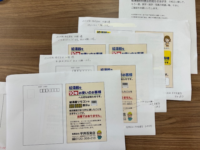 給湯器の「888」エラー対策のはがきが、やっと完成しました!