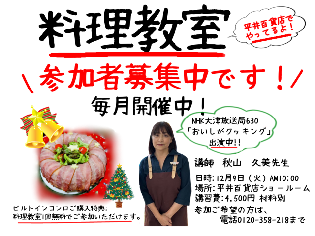 実は…当店でビルトインコンロをご購入いただいたお客さまは、料理教室に“1回無料”でご参加いただけます!