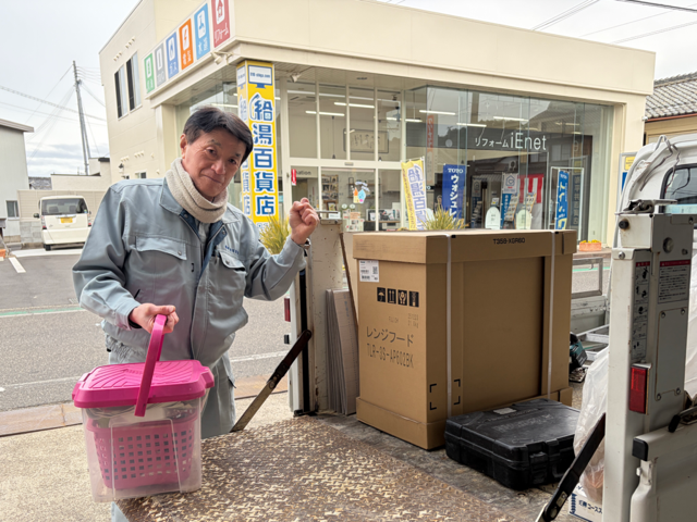 お掃除セットを持って、レンジフードの交換工事に出発するトオル社長です!