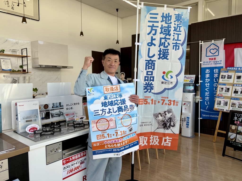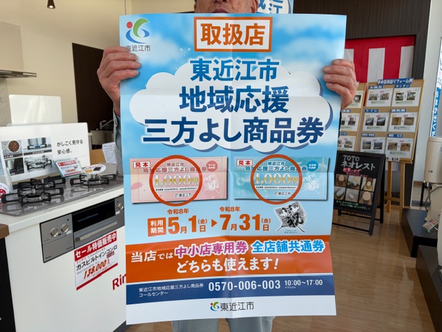 5月1日からスタートする「東近江市 地域応援 三方よし商品券」の取扱店ポスターとのぼり旗が、当店にも届きました!